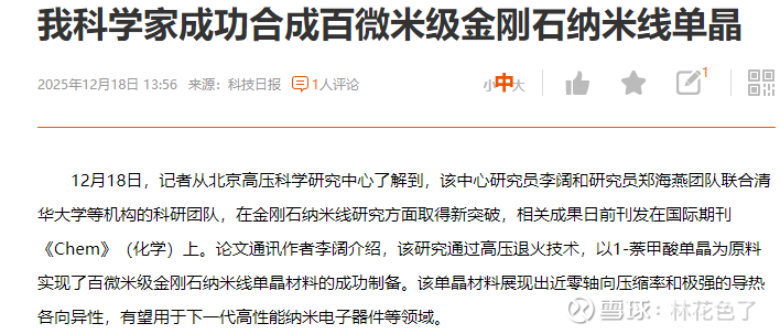 北京高压科学研究中心李阔、郑海燕团队联合清华大学开发的百微米级金刚石纳米线单晶材料,凭借近零轴向压缩率和极强导热各向异性,在下一代高性能纳米电子器件领域具有巨大应用潜力。以下上市公司将显著受益: