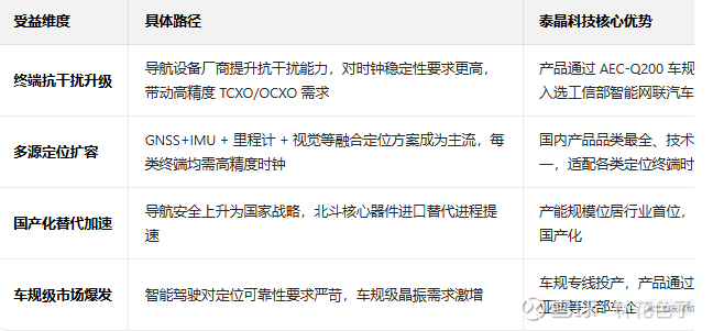 泰晶科技是上述抗干扰核心设备的 “基础支撑”,逻辑具备不可替代性:抗干扰设备(如华力创通的抗干扰组件、北斗星通的芯片)要实现稳定定位,必须依赖高精度时频器件提供 “时间基准”—— 泰晶的 **TCXO(温补晶振)** 是导航终端的核心时钟组件,可保障抗干扰设备在复杂电磁环境下的定位精度,且已通过车规级认证、批量供货头部车企 / 北斗供应链。