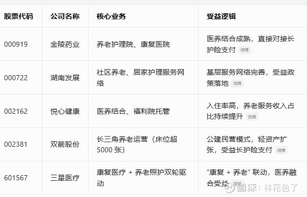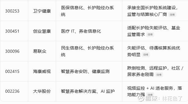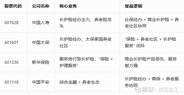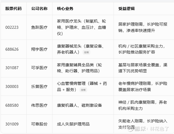 长护险核心受益标的清单,按四大板块分类,标注最新代码、核心业务与受益逻辑,便于直接参考。