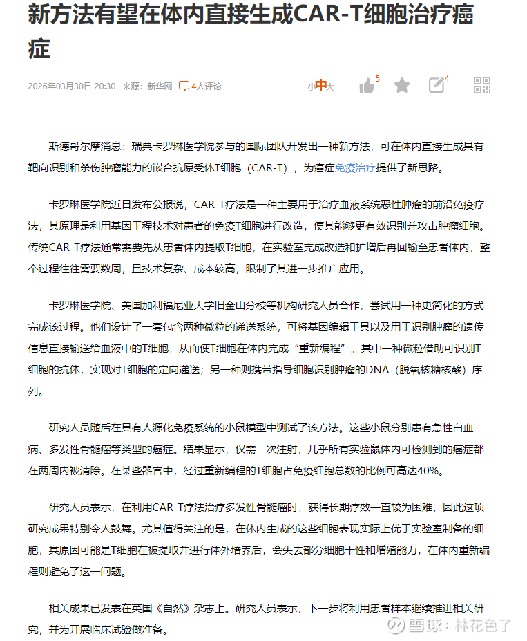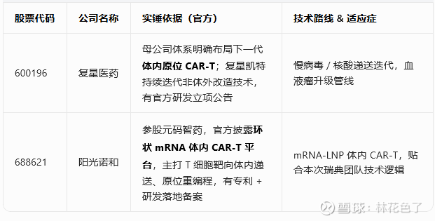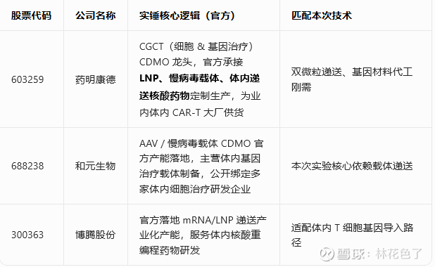 对标本次《自然》:体内直接递送、原位重编程 T 细胞,无需体外提取改造;只留 A 股、只认上市公司公告 / 国家药监局 CDE 临床备案,剔除蹭概念。
