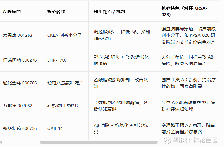 核心对标基准:KRSA-028→口服小分子、穿透血脑屏障、靶向 tau/Aβ、神经退行性阿尔茨海默病、临床前创新管线(全程只看药物 / 靶点 / 机制 / 进度,剔除借壳、重组、壳资源逻辑)