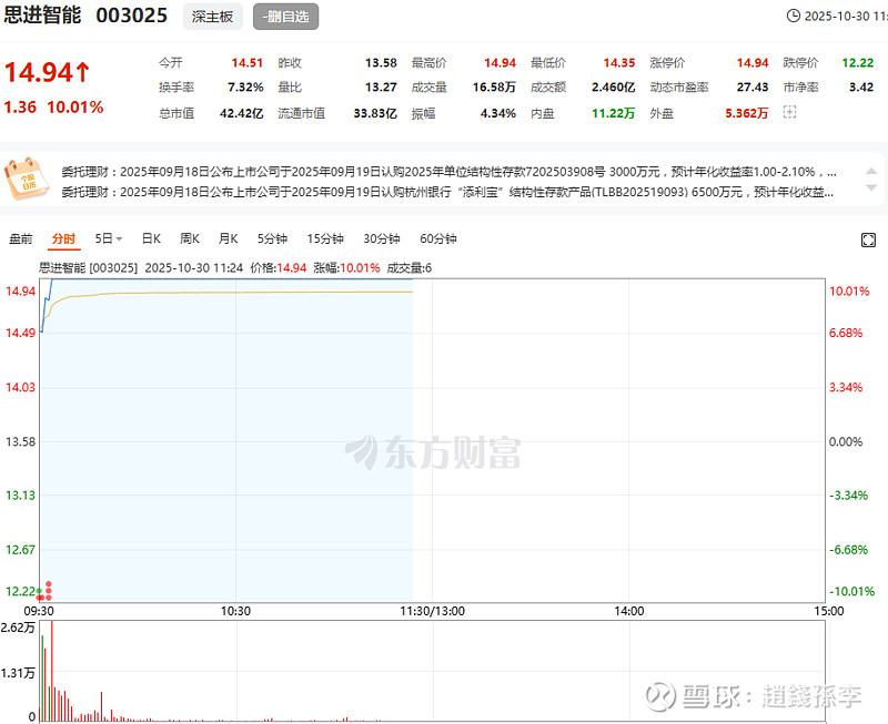 早上看到思进智能涨停,我一点都不意外,这涨停,说白了就是市场 “用脚投票”,投资者又不傻,20.73 元的回购价摆在那,涨停完距离20.73还有接近40%的溢价空间,明眼人都能看出来管理层对自家价值的认可,再加上公司之前净利润增长不错,基本面也撑得住,是市场真认可管理层的信心,也认公司未来的潜力,属于很实在的正向反馈了。公司属于工业母机概念板块,长期发展受益于新型工业化和机器人等国家战略导向。