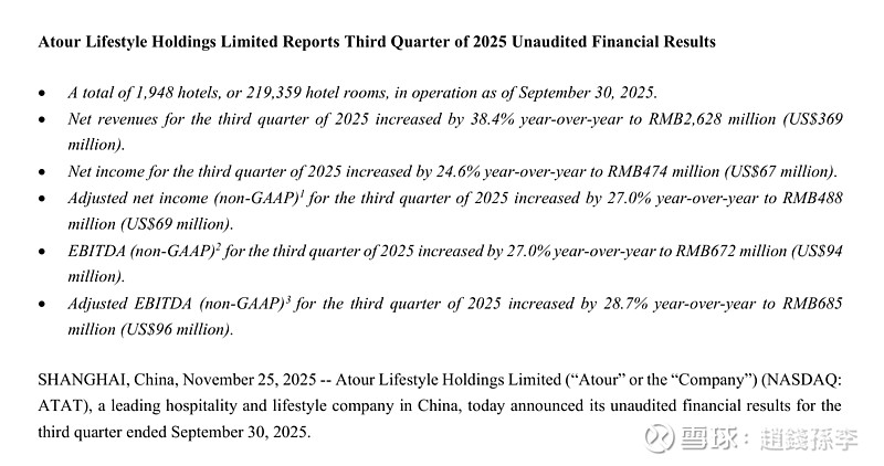 据悉,三季度公司实现营业收入26.28亿元(人民币,下同),同比增长38.4%;调整后净利润4.88亿元,同比增长27.0%;调整后EBITDA 6.85亿元,同比增长28.7%。零售业务保持强劲增长,第三季度GMV达9.94亿元,同比增长75.5%,基于酒店业务的稳健发展与零售业务的亮眼表现,亚朵上调全年收入指引至同比增长35%。