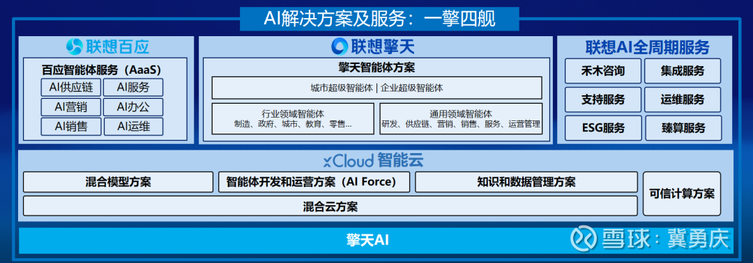“联想xCloud智能云”,是帮助企业客户打造智能体的一站式平台。它提供混合模型方案、智能体开发和运营方案、知识和数据智能方案、混合云方案以及可信计算方案。