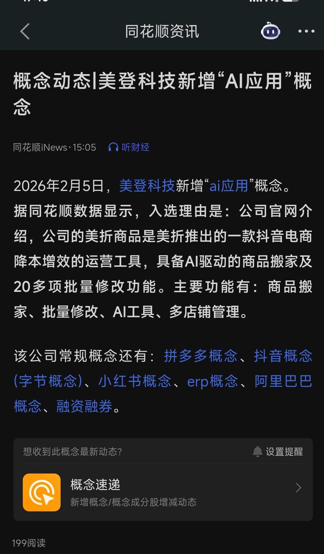 美登科技今天收盘新增ai应用概念。