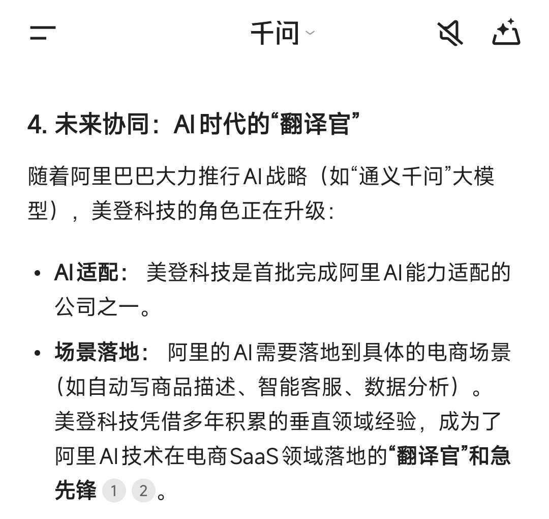 场景落地: 阿里的AI需要落地到具体的电商场景(如自动写商品描述、智能客服、数据分析)。美登科技凭借多年积累的垂直领域经验,成为了阿里AI技术在电商SaaS领域落地的“翻译官”和急先锋通道”。
