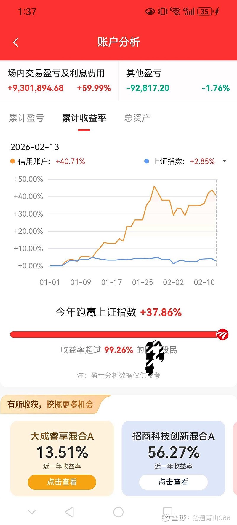 今年开年1个半月,炒股收益额920万,收益率40%,跑赢上证指数38%,比2026年1月28日的最高峰缩水170万,跑赢99%的散户。