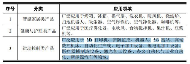 按照科力尔的分类,运动控制类产品被广泛应用于3D打印、安防监控、机器人、5G基站、锂电池加工设备、新能源汽车等领域。