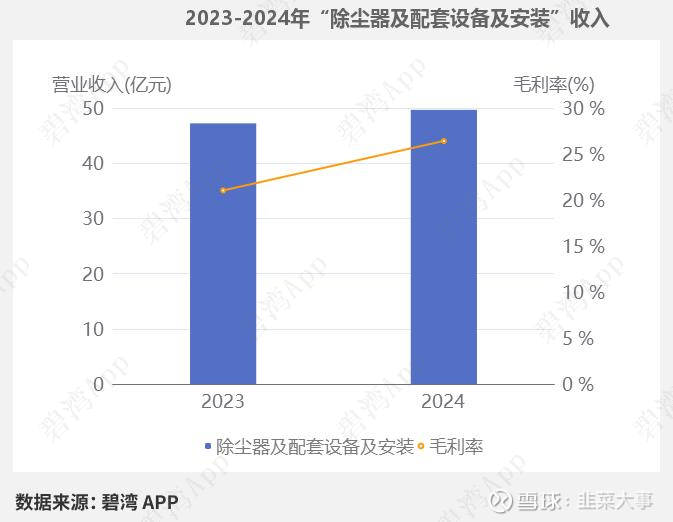 2024年除尘器及配套设备及安装营收49.66亿元,同比去年的47.22亿元小幅增长了5.17%。同期,2024年除尘器及配套设备及安装毛利率为26.42%,同比去年的21.04%增长了25.57%。