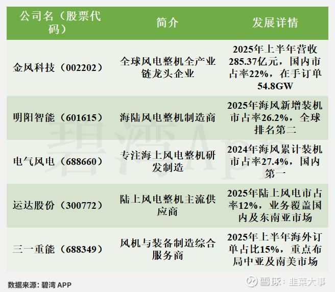 金风科技为全球风电整机领军企业,2024年国内新增装机市占率22%,全球市占率16%,连续14年全国第一、3年全球第一;2025年上半年对外销售容量10.64GW,同比增长106.6%,国内新增海风市占率提升至19%。