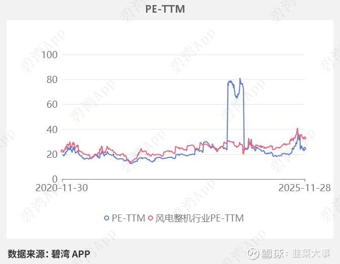 在2025年11月28日,金风科技的PE-TTM是24.53,而风电整机行业的PE-TTM是32.97,金风科技低于风电整机行业的PE-TTM。