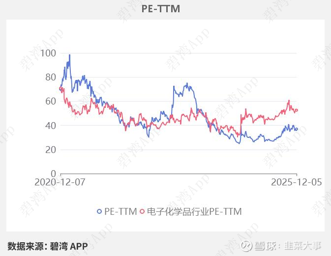 在2025年12月05日,国瓷材料的PE-TTM是36.95,而电子化学品行业的PE-TTM是52.56,国瓷材料低于电子化学品行业的PE-TTM。
