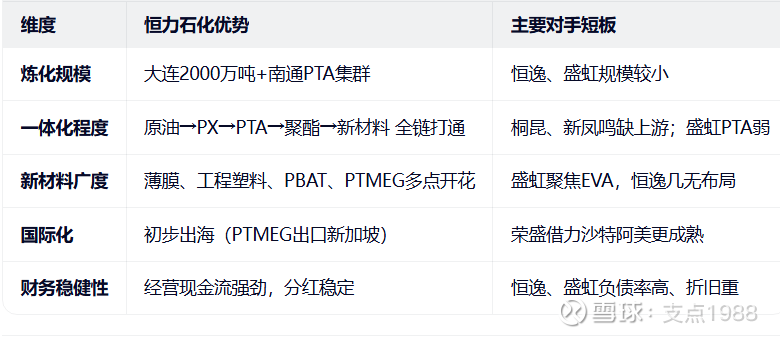 与恒力对比劣势: 聚酯产业链较弱,民用涤纶、工业丝规模远小于恒力; 新材料转型速度慢于恒力(如光学膜、PBAT尚未形成规模); 管理效率和精细化运营略逊。