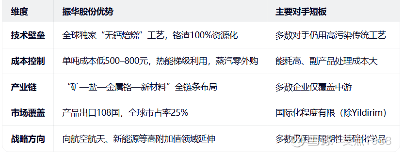 振华股份已构建起“技术+成本+产业链+战略前瞻”四位一体的护城河。当前真正的竞争对手仅剩四川银河化学(国内)与土耳其Yildirim集团(国际),其余企业或规模不足,或战略重心偏离。在“双碳”与高端制造国家战略背景下,振华的竞争优势有望持续扩大,从“铬盐龙头”迈向“铬基新材料平台型巨头”。