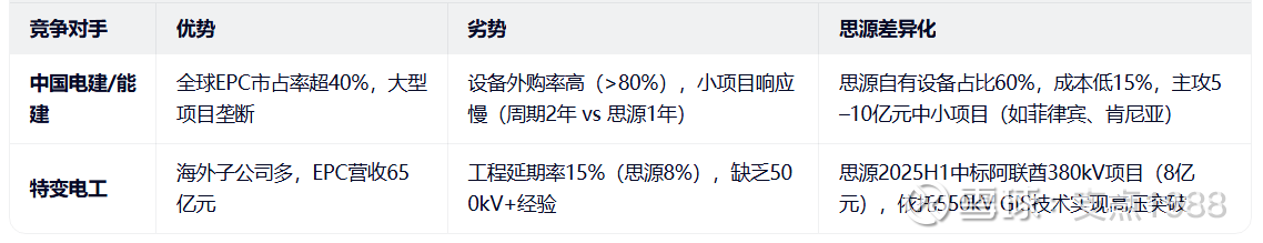 劣势: 中低端产品性价比低于思源(中压GIS毛利率28% vs 思源30.9%); 定制化响应慢(适配周期6个月 vs 思源3个月)。