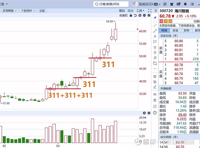 $海川智能(SZ300720)$ :311战法连奏+筹码锁定,半导体预期拉满!- 技术面:311战法三连击,平台突破后筹码高度锁定,量价齐升趋势强劲:rocket:- 基本面:昆山国资入主,自动衡器高毛利稳盘,半导体转型预期强烈- 题材:机器人+物联网+半导体重组预期,事件驱动型成长标的( 真人评: 筹码锁定很严重,但是整个趋势涨的很高,如果持续强者恒强,注意高危险。⚠️风险提示:本文仅为题材逻辑分享,不构成投资建议,股市有风险,投资需谨慎。