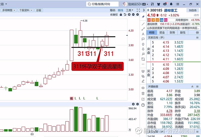 311 战法点火$通裕重工(SZ300185)$双子座流星雨形态成型!一波拉升后横盘洗盘,311 孕线结构反复蓄势,量能持续放大,风电赛道风口加持,一旦突破箱体上沿,将迎来加速上涨行情!⚠️ 风险提示:本文仅为技术形态分析,不构成任何投资建议,股市有风险,投资需谨慎。