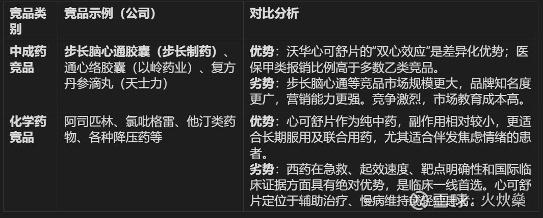 劣势:心可舒片在中成药心血管领域凭借专利和医保优势占据了有力利基市场。但与化学药是互补而非替代关系,市场天花板受限于中成药在整个心血管治疗方案中的辅助地位