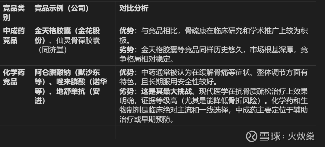 劣势:同类竞品很多,比如龙骨壮骨冲剂等。而且化学药品的治疗效果论证程度更高。骨疏康面临强势西药竞品的挤压,其中成药市场是一个“缝隙市场”,增长严重依赖对“中西医结合”治疗理念的推广和患者教育。
