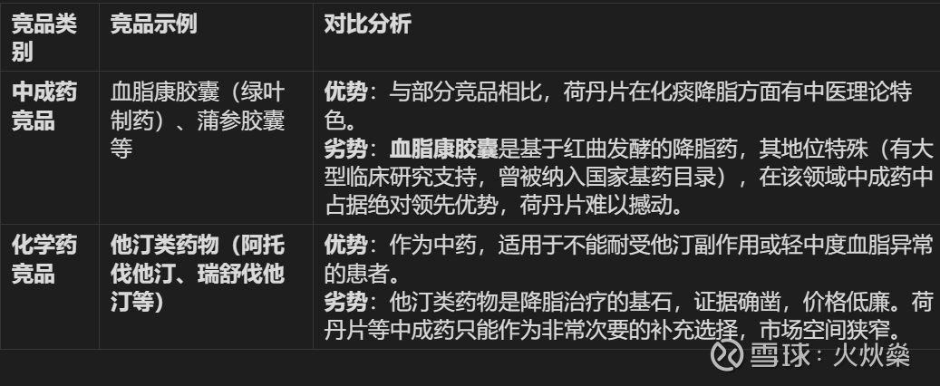 劣势:荷丹片在降脂领域面临“内外夹击”,外部有强大的他汀类药物,内部有血脂康这样的中成药巨头,是其四大支柱中竞争地位相对最弱的产品。