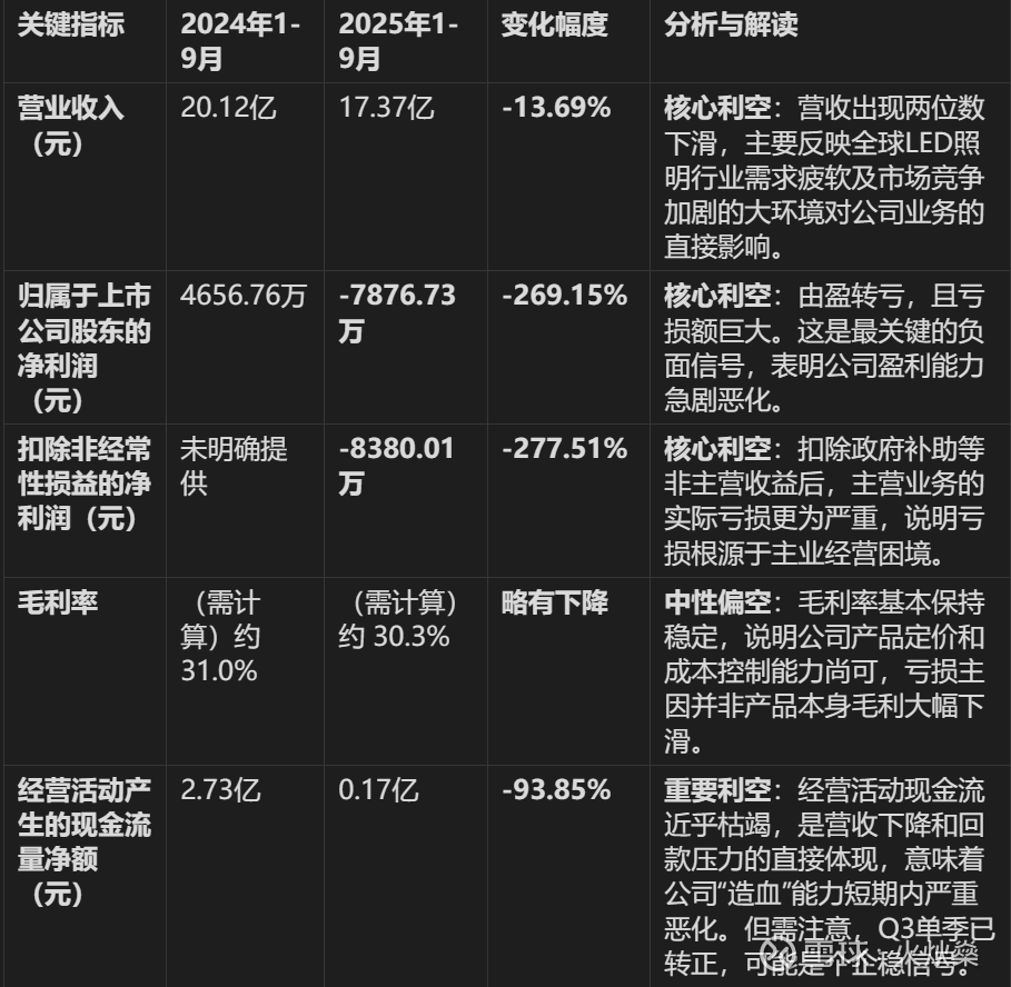 外部冲击(主因):全球宏观经济环境影响下,LED照明行业需求疲软,导致公司营收规模收缩。同时,市场竞争加剧可能压低了利润空间。