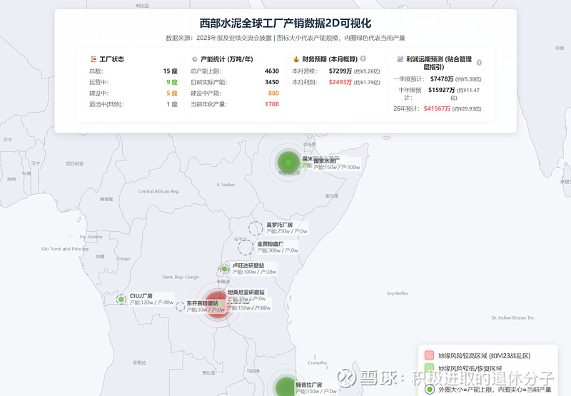 网页链接$西部水泥(02233)$ 按年报跟交流会的内容整了个可视化,逻辑也都写在图上面了。工厂数据我看了下应该没啥问题,盈利数据逻辑也在图上,是按计算器算的。月数据是纯粹的本月产量*价格,季度、年度数据是产量(包括建设中的)、价格来算,然后往老张预测30%~50%增长的结果上靠。