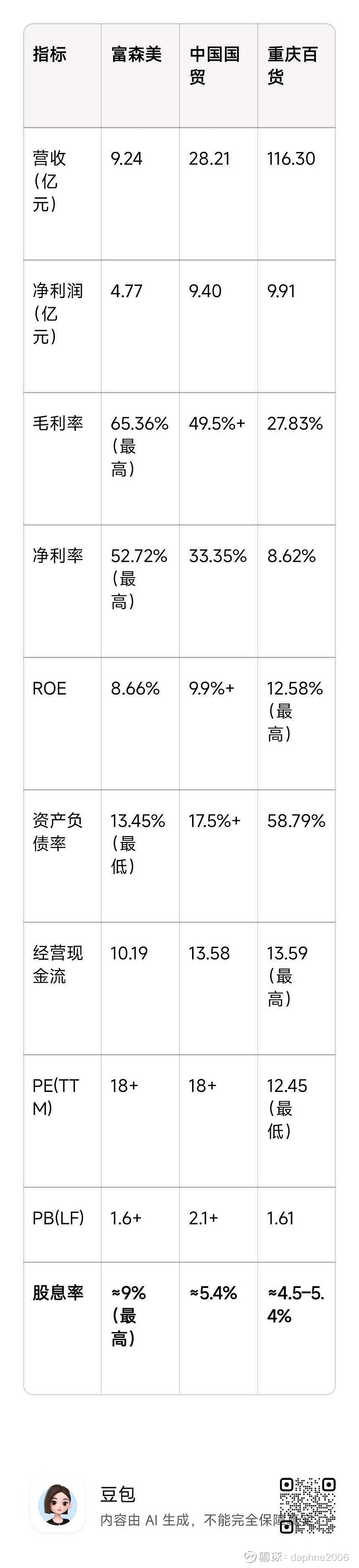 $富森美(SZ002818)$ $中国国贸(SH600007)$ $重庆百货(SH600729)$三只包租公类型的股票,都是拥有核心城市中心地段的卖场。让豆包分析了一下哥三个的指标对比。豆包直接给的下面结论,极简结论(直接给结论)1. 富森美利润质量最强、负债最低、股息率≈9%,纯高股息现金牛。2. 中国国贸地段最核心、现金流最稳、股息≈5.4%,最稳健收息。3. 重庆百货规模最大、ROE最高、估值最低(PE12.4),股息中等,偏低估反转。你还别说多少,我觉得还挺靠谱。