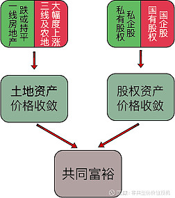如果相信国家,相信国运,相信我们这代人有智慧,走好伟大复兴的最后一里路。我们就要知道要实现共同富裕,必须在资产端想办法,作为国民财富最大的体量的房地产,一二线和三四线城市房产以及农村自建房的价格缩小差距是共同富裕的逻辑必然。股票作为国民财富的第二大类别,体现少数人利益的私营企业和体现全体国民利益的国有企业,估值,社会评价缩小差距,也是共同富裕的逻辑必然。