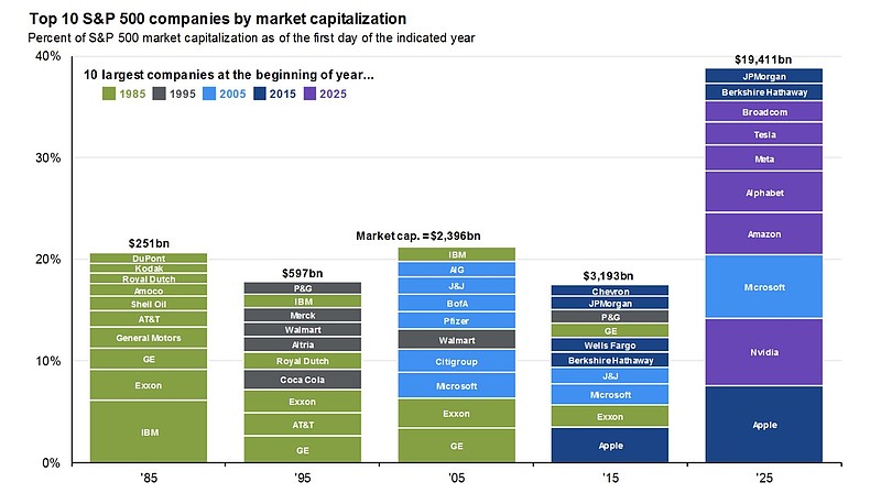 这图几乎每年都要分享一次。几乎没10年,最大市值的10家公司就会大换血一遍。今年集中度和市值都是空前的。