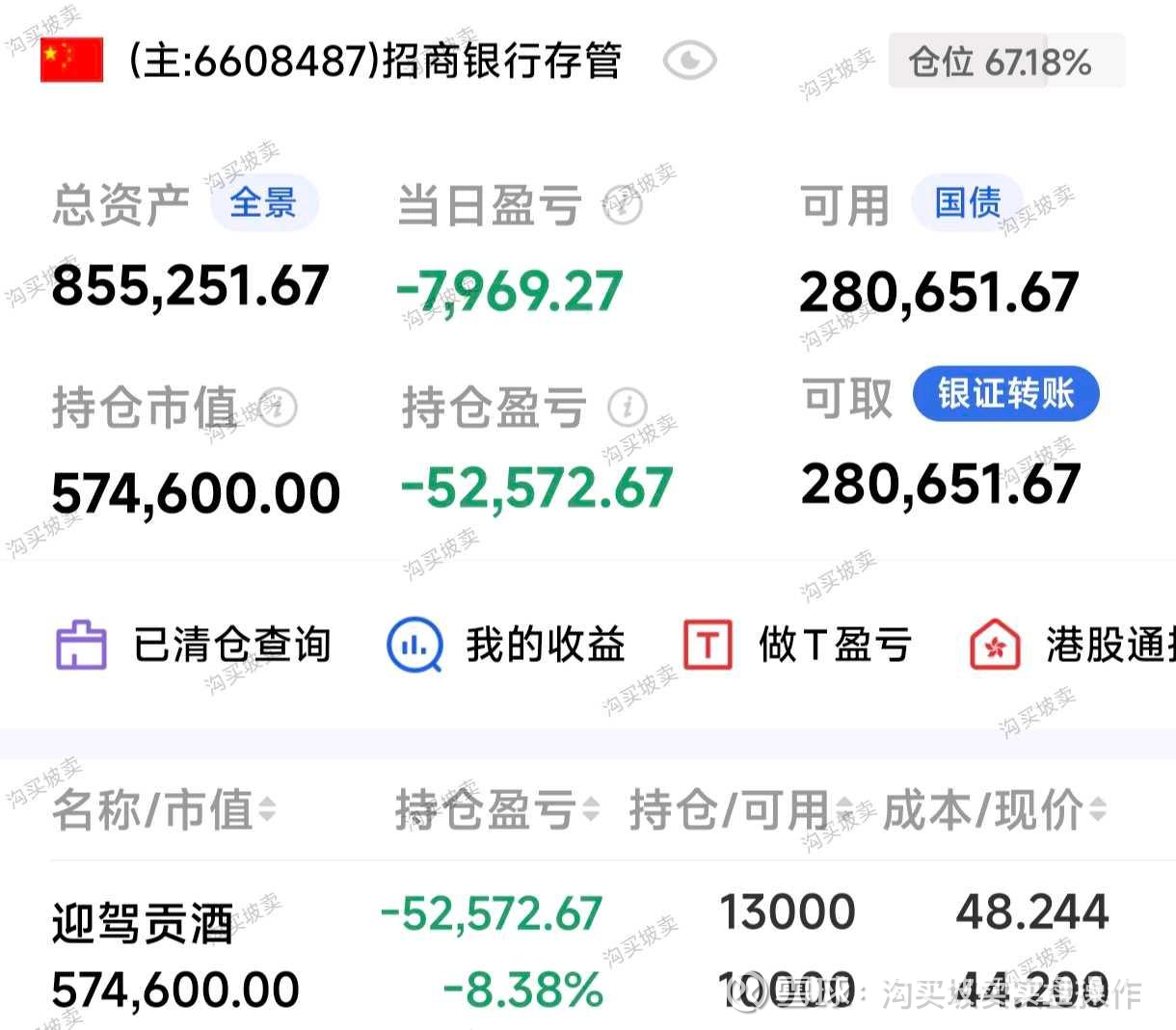 今日操作:今天在44.35元买入3000股迎驾贡酒。收盘账户情况,持有迎驾贡酒1.3万股,成本价:48.24元。可用资金:28.06万元。资产总值:85.52万元。目前股票仓位:67%。