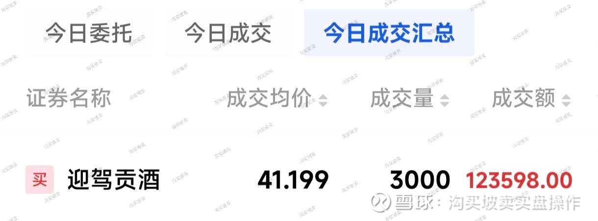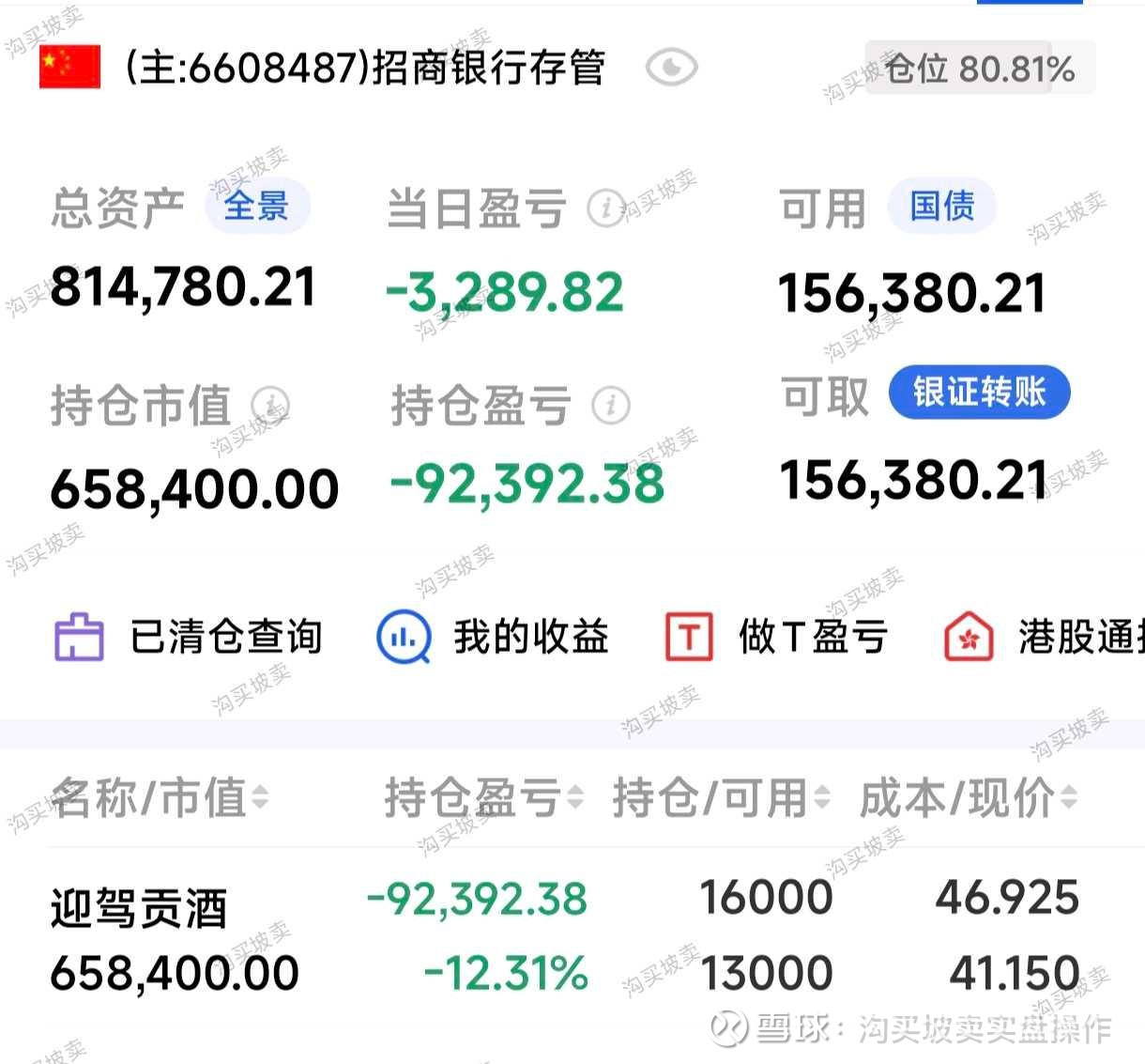 今日操作:今天在41.19元买入3000股迎驾贡酒。收盘账户情况,持有迎驾贡酒1.6万股,成本价:46.92元。可用资金:15.63万元。资产总值:81.47万元。目前股票仓位:80%。