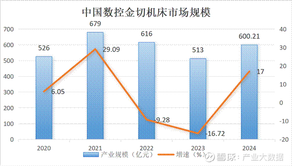 数控机床细分品类集中于成形机床和切削机床。数控成形机床市场规模持续扩张,2024年达1513.75亿元,2020-2024年复合增速8.1%,2024年增速5.75%,彰显稳健增长韧性;数控金切机床市场波动较大,2024年规模600.21亿元,同比下滑16.72%,主要受下游机械加工需求波动影响。