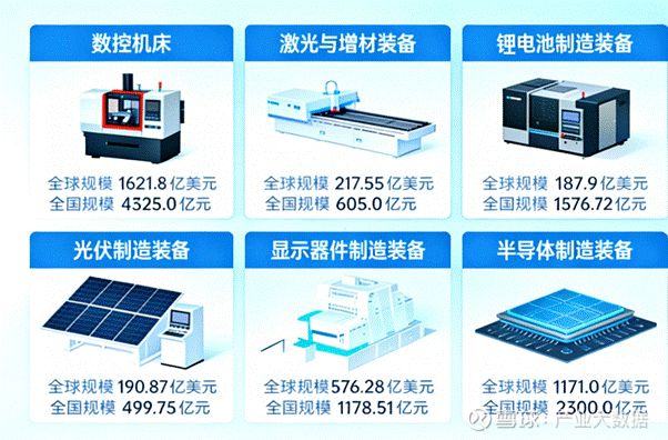 全球维度下,我国通用设备核心品类已形成规模优势。激光与增材装备全球规模217.55亿美元,锂电池制造装备187.9亿美元;数控机床全球规模1621.8亿美元,其中国内市场规模4325.0亿元,同比增长5.75%。细分领域呈现分化:光伏制造装备全国规模499.73亿元,同比高增21.26%;显示器件制造装备全国规模7908.25亿元,同比增长2.59%;精密仪器设备全球规模3462.98亿美元,国内市场1178.51亿元,同比下滑14.03%,反映高端领域仍面临竞争压力。