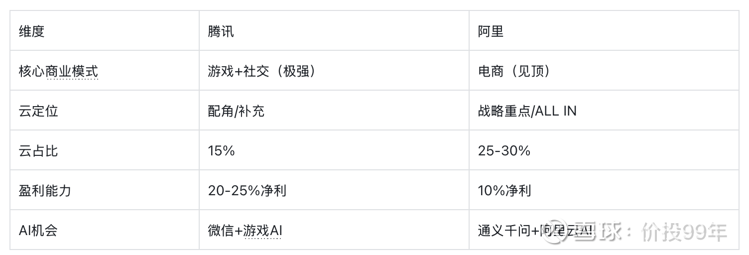 腾讯的聪明在于:核心商业模式本身就极强,云计算只是一个考量因素,可有可无。阿里的困境在于:电商见顶,没有选择,只能把云计算当未来。但AI可能改变一切——阿里在AI上的投入,可能是翻身的机会。