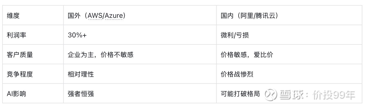 国内外云是两种生意——国外云30%利润率躺赚,国内云价格战苦逼,但AI可能改变格局。