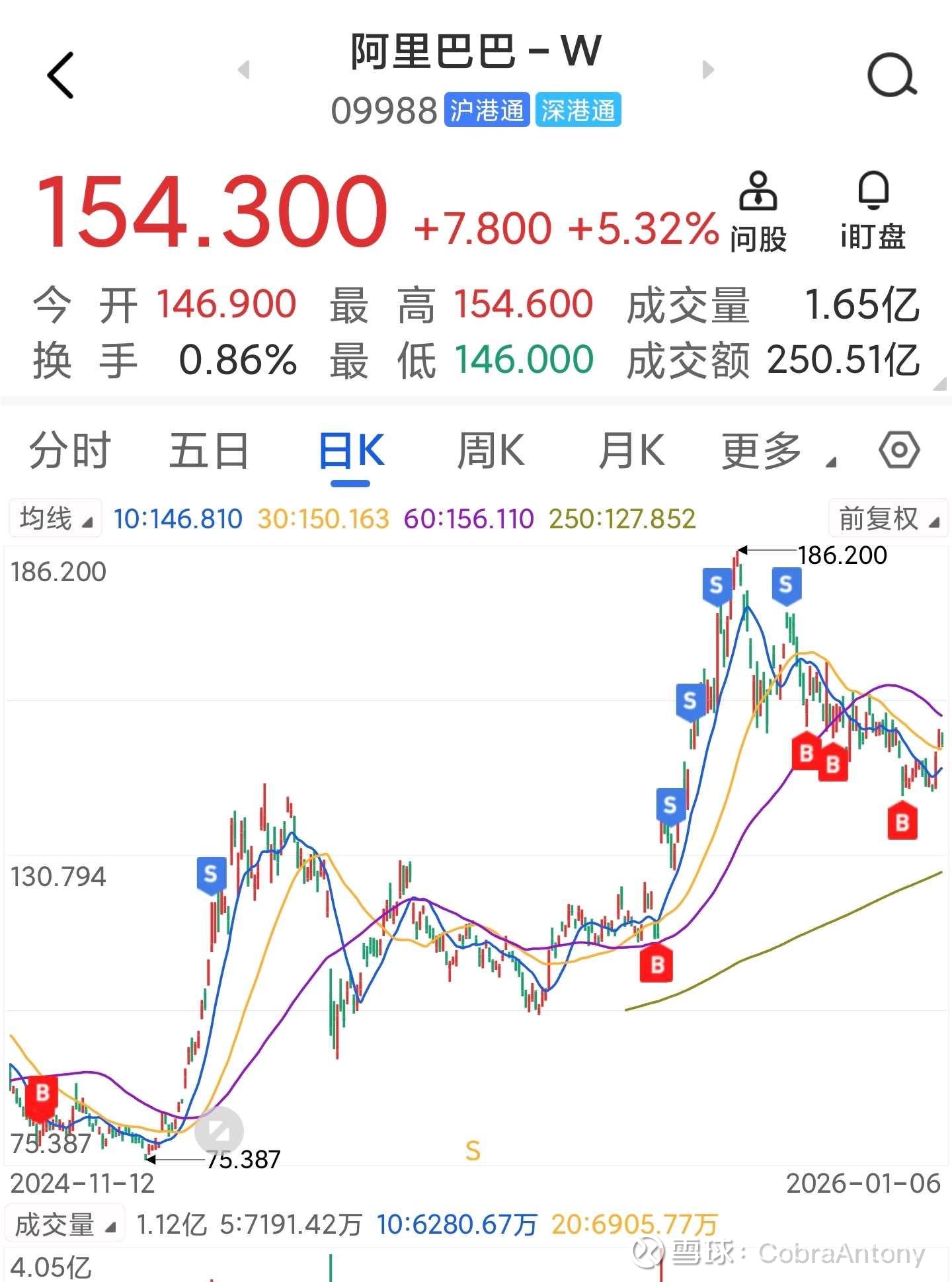 今天阿里巴巴再涨4~5个点,那整个图形就很好看了,基本就是脱离了下降轨,属于中期调整完成,开始上攻的趋势。