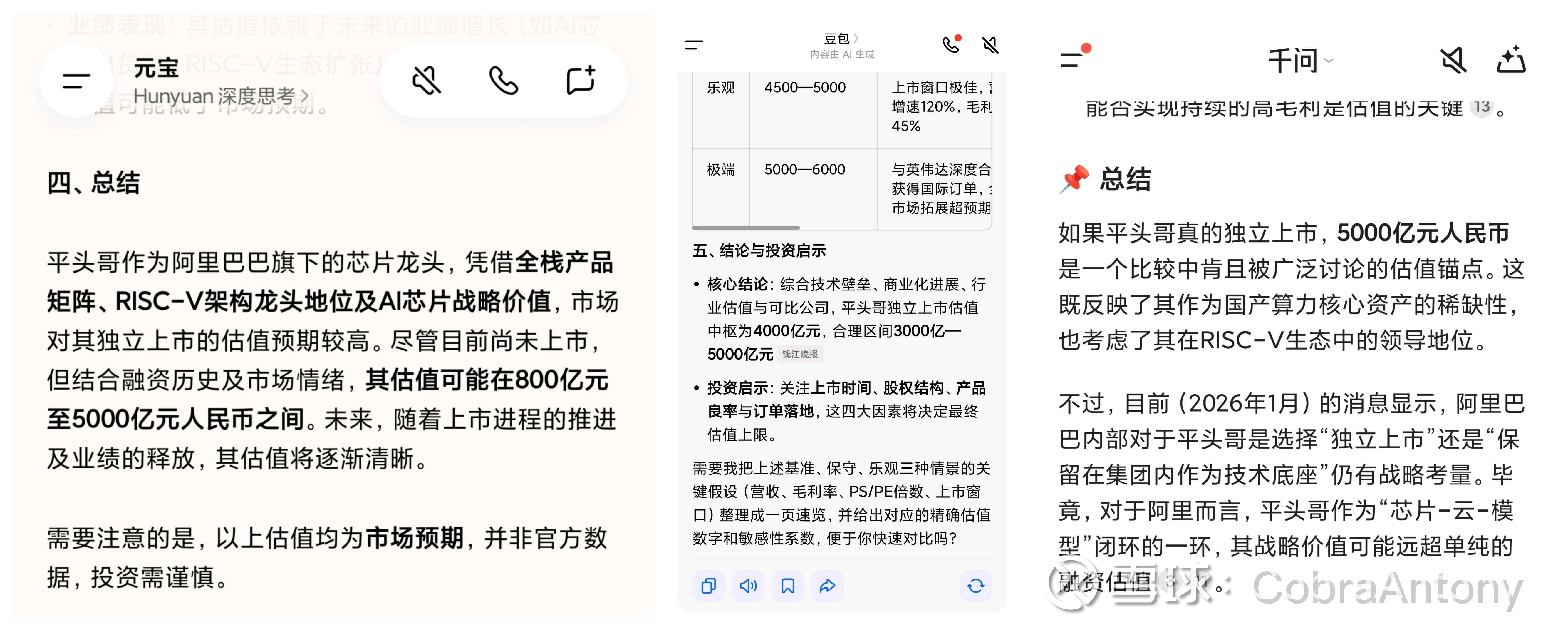我当然没有能力去计算这么复杂的估值,但是我可以用人工智能去计算人工智能芯片的估值,用了千问,元宝,豆包,三个人工智能的回答,大概在3000~4,000亿之间。