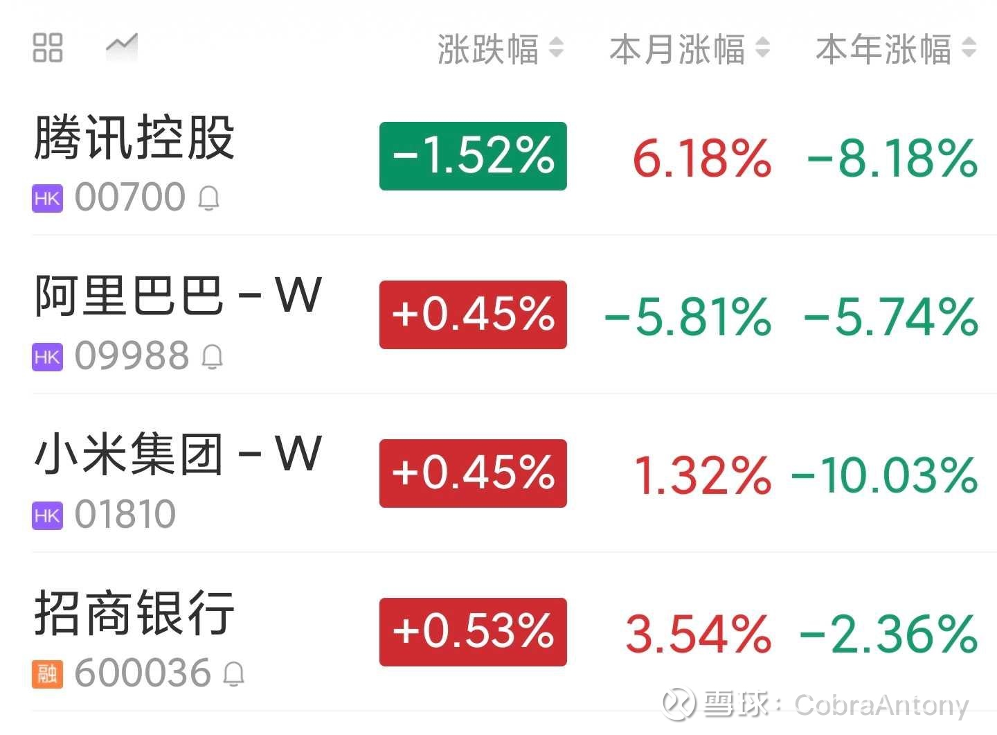 而科技股回调不少,特别是小米和阿里巴巴,下跌幅度是很大的。我高位抛了不少货,现在慢慢接回来。