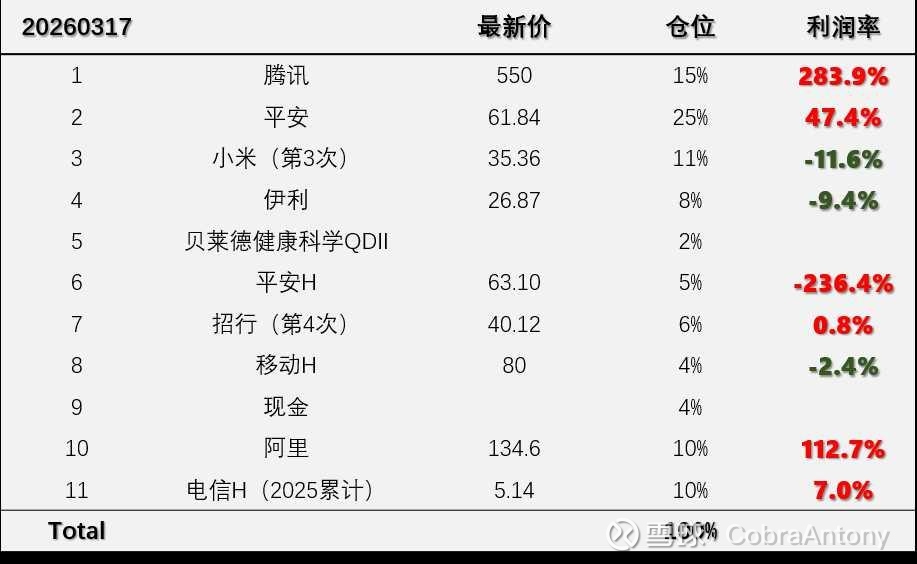 今天下午因为油价大涨5%,恒生科技指数在高位跳水,这不是个股的问题,这是整个大盘的情绪问题。我就继续用招行换小米和阿里,最新比例如下。