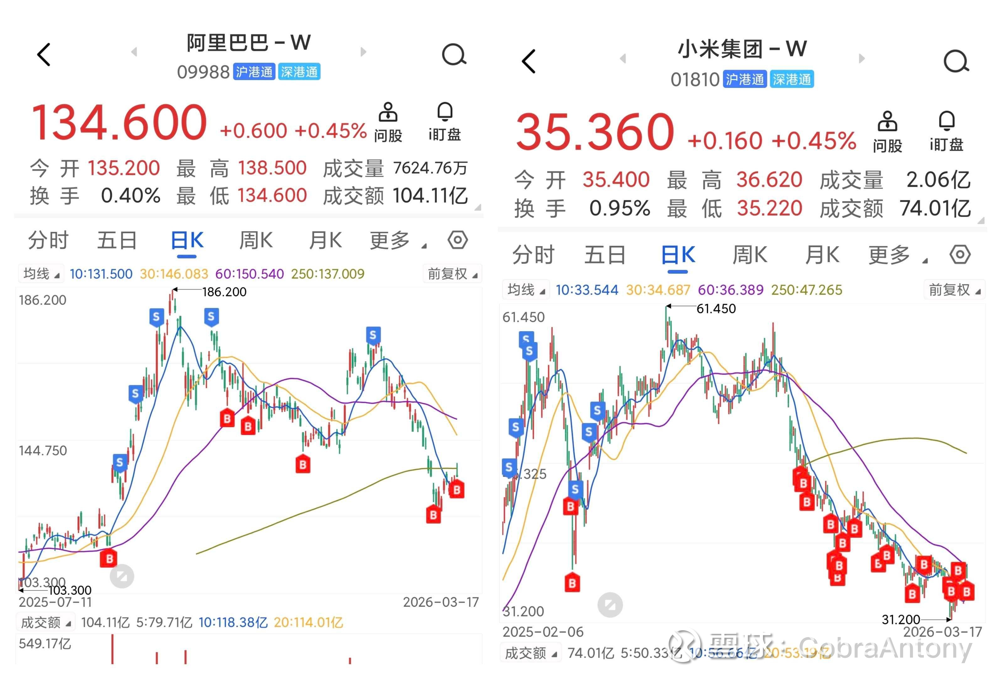 阿里巴巴这次135.6买回的是之前146卖出的,目前阿里巴巴的仓位回到了最高峰值的80%,小米已经回到了最高的仓位,并超出了一些。