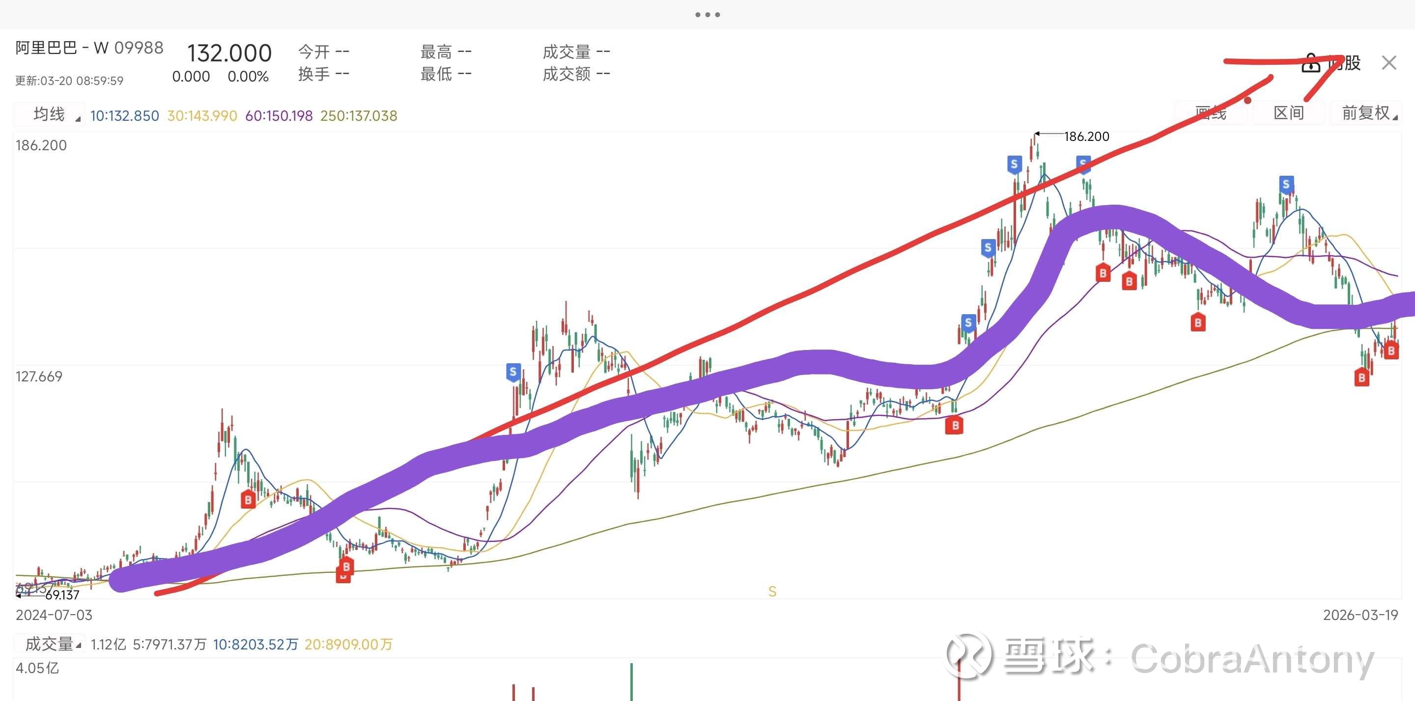 阿里巴巴曾经到过300,我在257清仓,100左右再建仓,掉到58,马云回归ai崛起,一路杀到180,现在回到130。