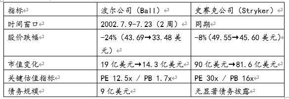 导火索事件:世通公司(WorldCom)破产引发市场恐慌,道指暴跌15.3%(9096→7702点)。情绪传导,波尔公司虽无负面消息,但包装行业被视为低增长赛道,投资者优先抛售;史赛克公司为医疗设备龙头,但高估值使其成为"流动性挤兑"牺牲品。
