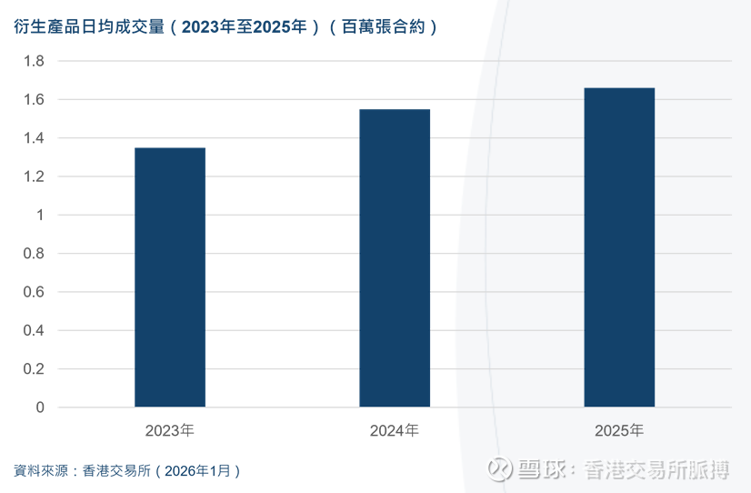 2025年,香港交易所衍生产品市场的日均成交量更创出新高,达166万张合约,按年增加7%。包括恒生生物科技指数期货在内的一系列新产品相继推出,为投资者提供更多投资工具选项,带动衍生产品成交量增长。