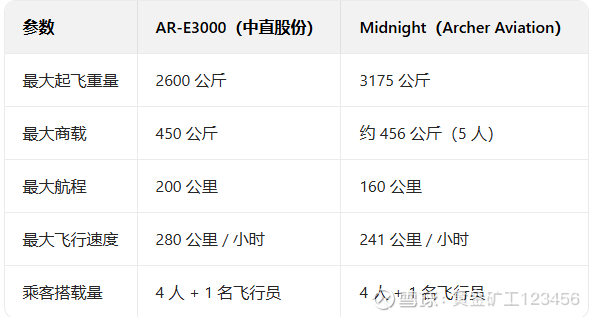 值得关注的是,AR-E3000 对标美国头部企业 Archer Aviation 的 Midnight 飞行汽车,二者采用相似的半倾转旋翼构型设计,但 AR-E3000 在综合性能与外观造型上实现全面超越。具体参数对比如下: