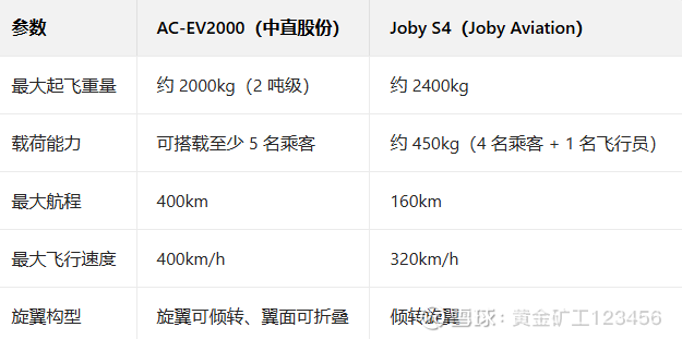 目前,AC-EV2000 已完成原理样机首飞与试飞验证,正推进原型机总装工作。其核心对标美国 Joby Aviation 的 Joby S4 飞行汽车,构型设计基本一致,但各项性能实现大幅领先,具体对比如下: