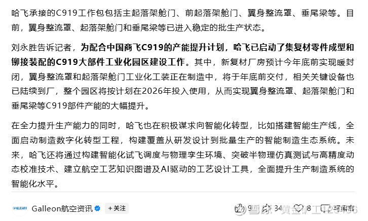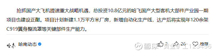中直股份为配合中国商飞C919的产能提升计划,中直股份的全资子公司哈飞已启动了集复材零件成型和铆接装配的C919大部件工业化园区建设工作,整个园区将按计划在2026年投入使用,从而实现翼身整流罩、起落架舱门和垂尾梁等C919部件产能的大幅提升。