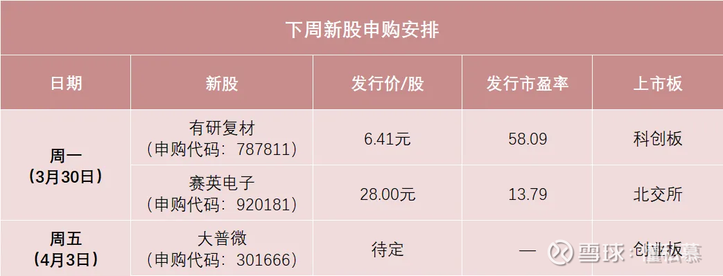 日程安排上,周一(3月30日)可申购科创板新股有研复材、北交所新股赛英电子,周五(4月3日)可申购创业板新股大普微。其中,有研复材是今年以来发行价最低的新股,其中签率可能较高。