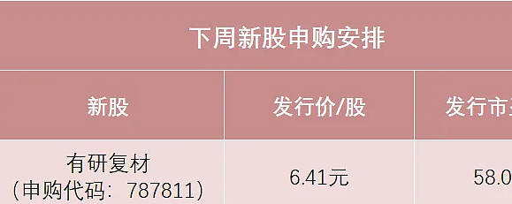 有研复材的发行价为6.41元/股,发行市盈率为58.09倍,参考行业市盈率为36.24倍。公司本次公开发行股票数量为13043.51万股,网上发行申购上限为18000股,顶格申购需配沪市市值18万元。