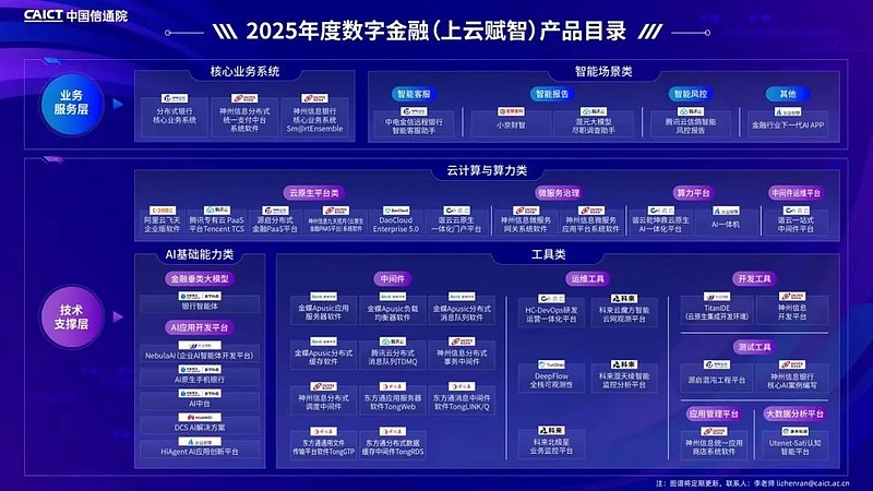 与此同时,2025年度数字金融(上云赋智)产品目录发布,该名录旨在甄选行业中优质的数字金融技术产品,助力精准对接业务需求与技术供给,加速构建安全、高效、普惠的数字金融生态。神州信息银行核心业务系统、分布式统一支付中台系统、九天揽月(云原生金融PAAS平台)系统、微服务网关系统、微服务应用平台系统、开发平台、分布式事务中间件、分布式调度中间件、统一应用商店系统、核心AI案例编写等产品案例上榜。