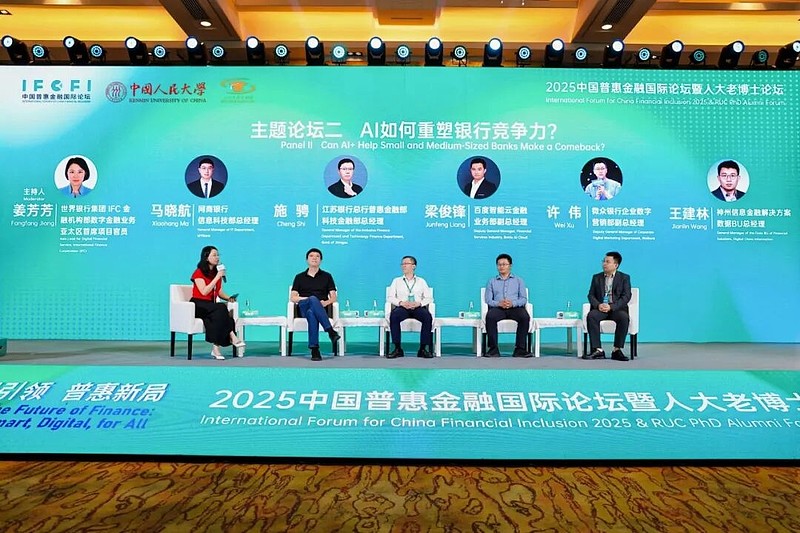 在9月24日举行的2025中国普惠金融国际论坛上,神州信息金融解决方案数据BU总经理王建林与网商银行信息科技部总经理马晓航;江苏银行总行普惠金融部、科技金融部施总经理施骋;微众银行企业数字营销部副总经理许伟;百度云金融事业部总经理徐旭等嘉宾围绕“AI如何重塑银行竞争力”展开交流。